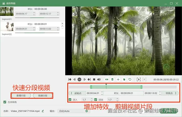 步骤3:在录制完成以后,可以对视频进行后期剪辑和保存。要怎样进行后期剪辑呢?只需要点击“高级剪辑”,就可以使用如快速分段、剪辑视频、增加特效等功能了。
