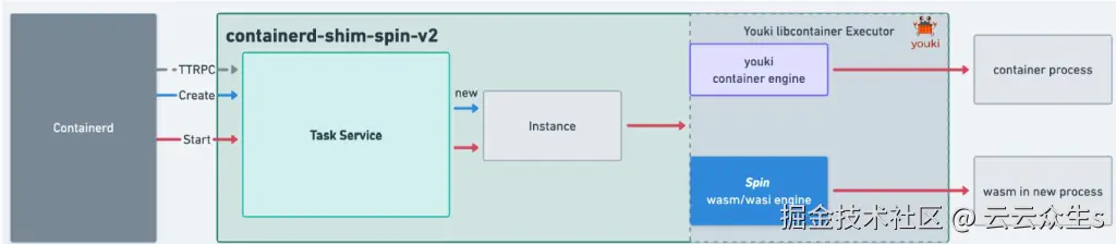 “秘诀在于shim架构,”周说。当containerd向shim发送RPC请求,要求shim创建一个容器并启动容器执行时,shim将创建一个新实例。周说,该实例将检查二进制文件的前几个字节,以查看这是Linux容器还是Wasm二进制文件。“如果是Wasm二进制文件,我们将使用内置于shim中的Wasm运行时来执行该实例;如果是Linux容器,我们将使用Linux运行时来运行该容器,”周说。“这都要归功于一个名为Yuki的令人惊叹的开源项目。它是用Rust编写的,我们使用Yuki的libcontainer执行器编写我们自己的Wasm运行时,并且可以将实例分派到Linux情况或Wasm情况。”