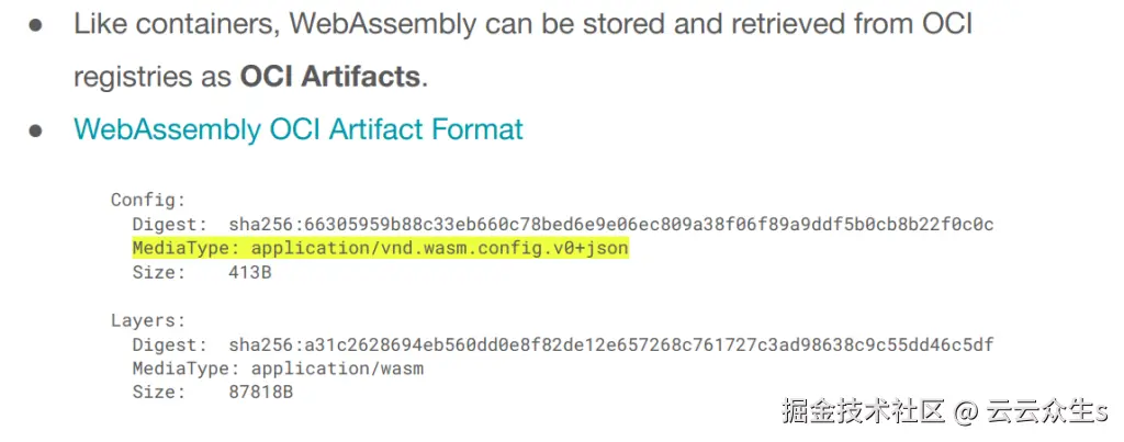 WebAssembly 在 Kubernetes 上展现出良好的前景,这要归功于 WebAssembly 现在符合 OCI 注册表标准,成为 OCI 工件。这使得 Wasm 能够满足 Kubernetes 标准和容器化的 OCI 标准,特别是 OCI 工件格式。它还涉及与 Kubernetes Pod、存储接口等的兼容性。在这方面,它是朝着将 Wasm 用作容器替代方案迈出的一步。