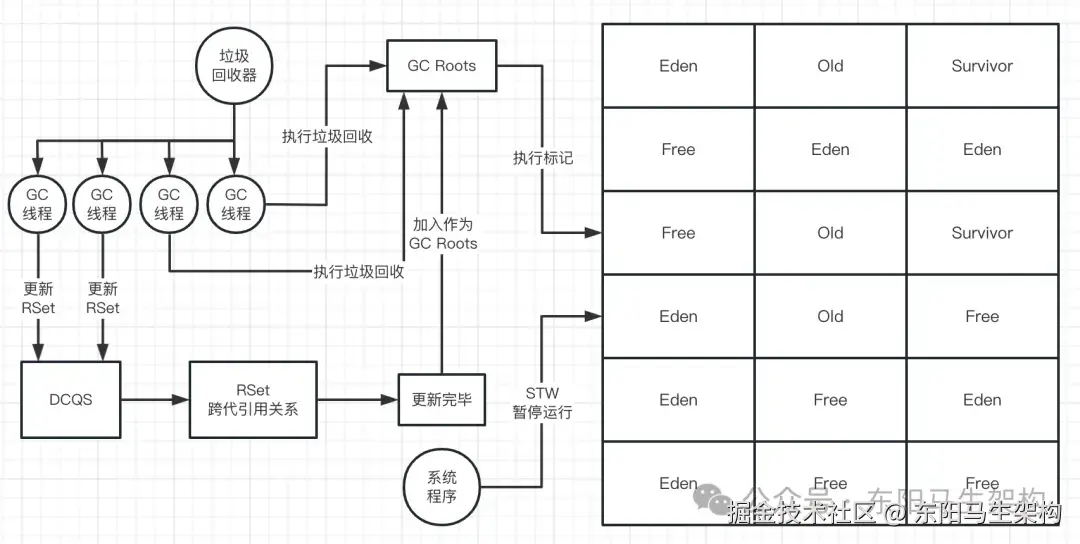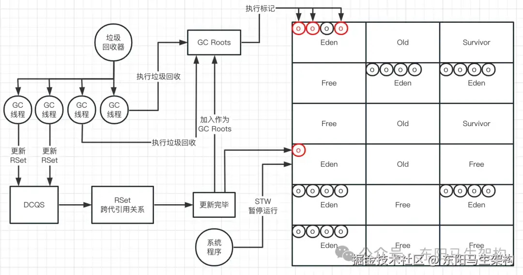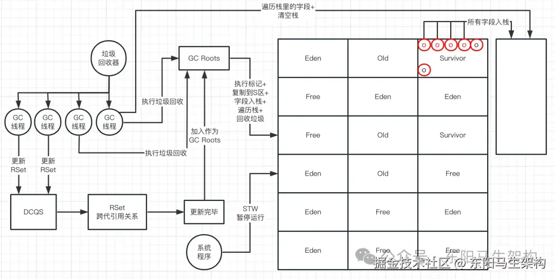 整个标记GC Roots + 更新RSet的过程,是由多个线程一起并行处理的。比如现在有4个GC线程参与垃圾回收,那么就会有两个线程从GC Roots出发去标记对象,有两个线程去消费DCQS然后更新RSet。接着Rset更新完毕后,就把RSet作为GC Roots继续去执行对象标记工作。