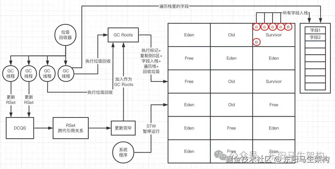 等到所有的GC Roots + RSet直接引用的对象都复制完毕后,再逐一对栈中的字段Feild进行遍历,找到所有存活的对象,然后再把找到的存活对象放入Survivor区中。