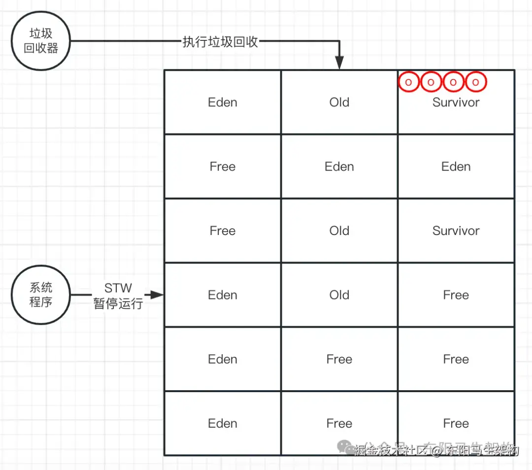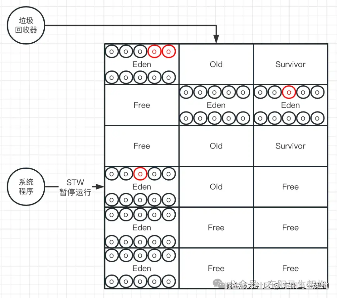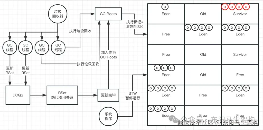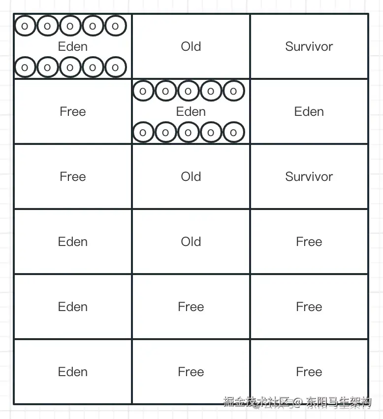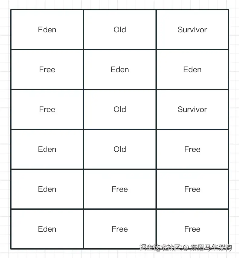 YGC使用的算法是复制算法,也就是会把新生代的所有Region按照Eden、Survivor做类型标识。在执行垃圾回收时,首先对存活对象进行标记。然后把存活对象复制到S区,接着就把所有的垃圾对象全部回收掉。注意:G1的Region分布,对于一个分代而言,不一定是连续的。