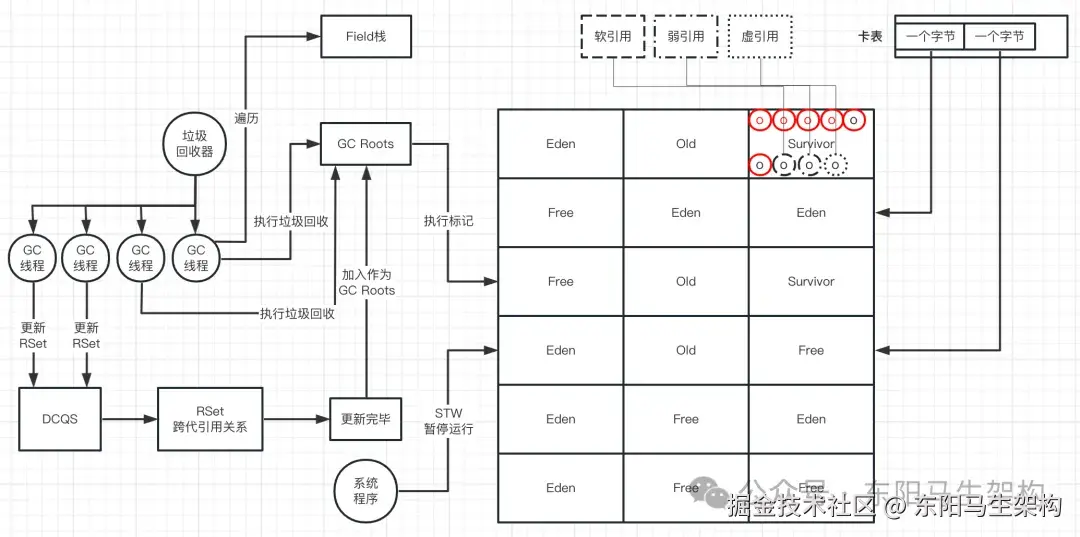 另外,把RSet作为GC Roots的意思是:RSet中映射到卡表对应的卡页中的所有对象都会作为GC Roots。因为卡页本身很小,对象数量也很少,所以可以把RSet都作为GC Roots。然后找到这些GC Roots直接引用的对象,再复制到Survivor区。