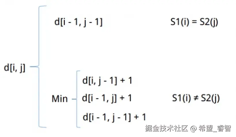 动态规划法通过构建一个二维数组来存储子问题的解,从而避免了重复计算。我们定义dp[i][j]为将word1的前i个字符转换为word2的前j个字符所需的最小操作数。状态转移方程取决于当前字符是否相同,具体如下。