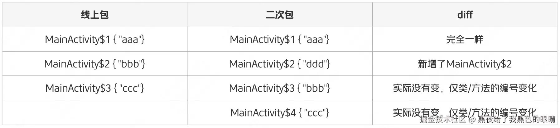 - 混淆:通过将 class/field/method 的名称重命名为一个无意义的短字符,增加逆向难度,减少包大小。二次打包需要保证和线上包的混淆保持一致,不然补丁加载后因调用异常而发生崩溃。