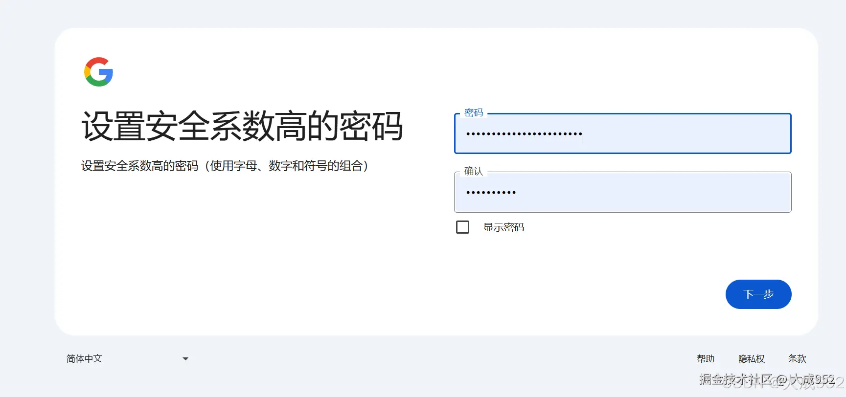 设置密码(使用字母、数字和符号的组合)