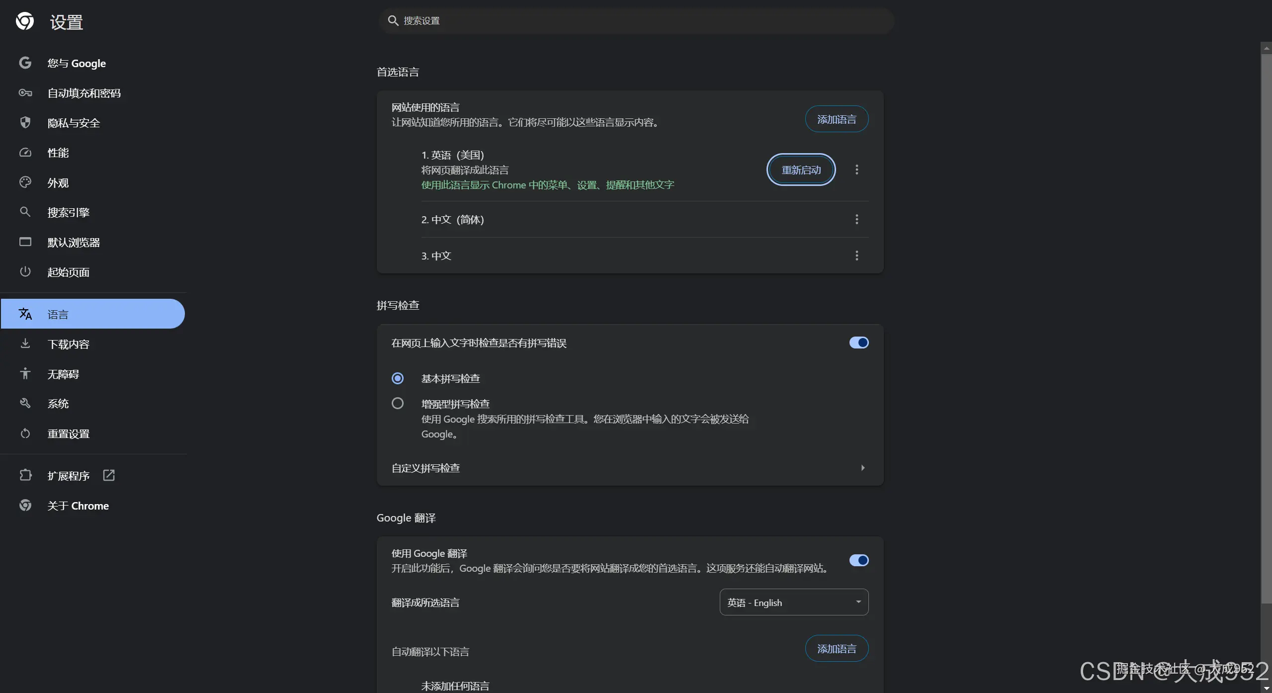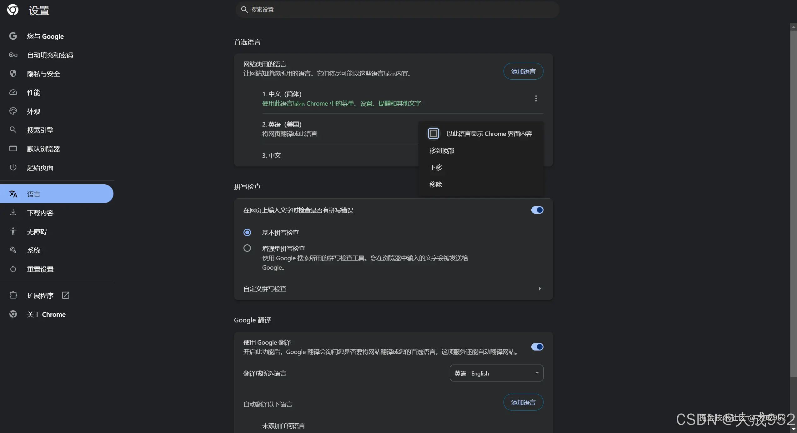 语言-网站使用的语言-英语(美国)三个点-勾选以此语言显示Chrome界面内容