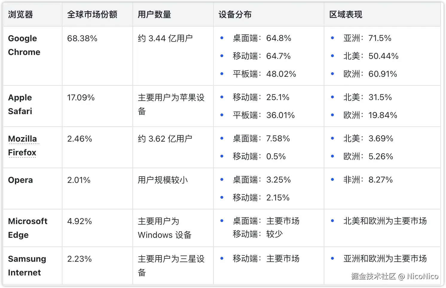 | 浏览器 | 全球市场份额 | 用户数量 | 设备分布 | 区域表现 |