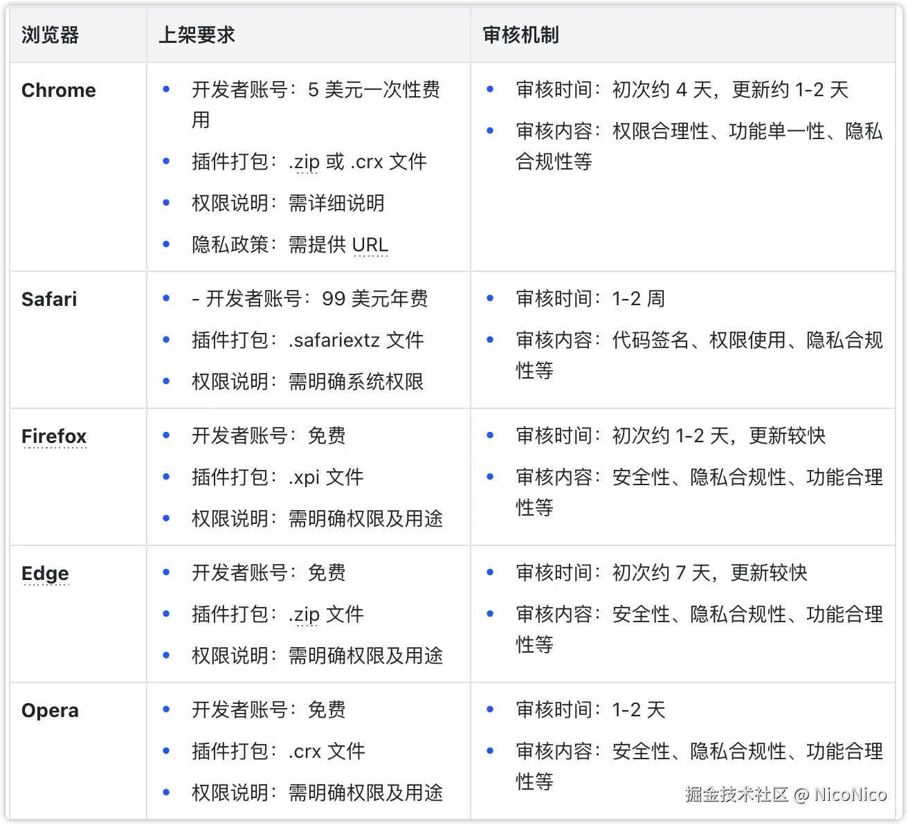 | 浏览器 | 上架要求 | 审核机制 |
