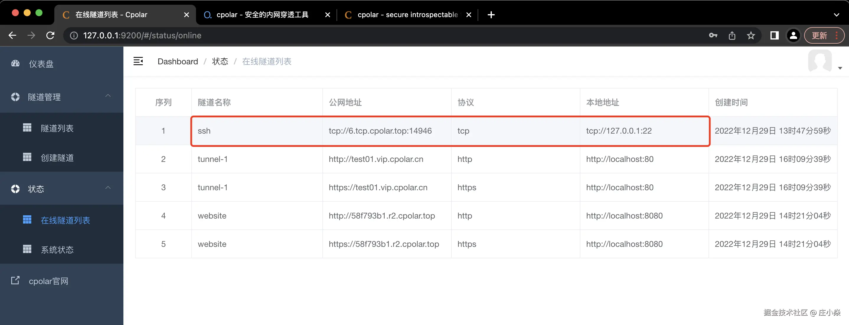 点击左侧仪表盘的状态——在线隧道列表,找到ssh隧道,可以看到系统有自动生成相应的公网地址,将其复制下来,注意<font style="color:rgb(199, 37, 78);background-color:rgb(249, 242, 244);">tcp://</font>无需复制,本例为<font style="color:rgb(199, 37, 78);background-color:rgb(249, 242, 244);">6.tcp.cpolar.top:*****</font>。