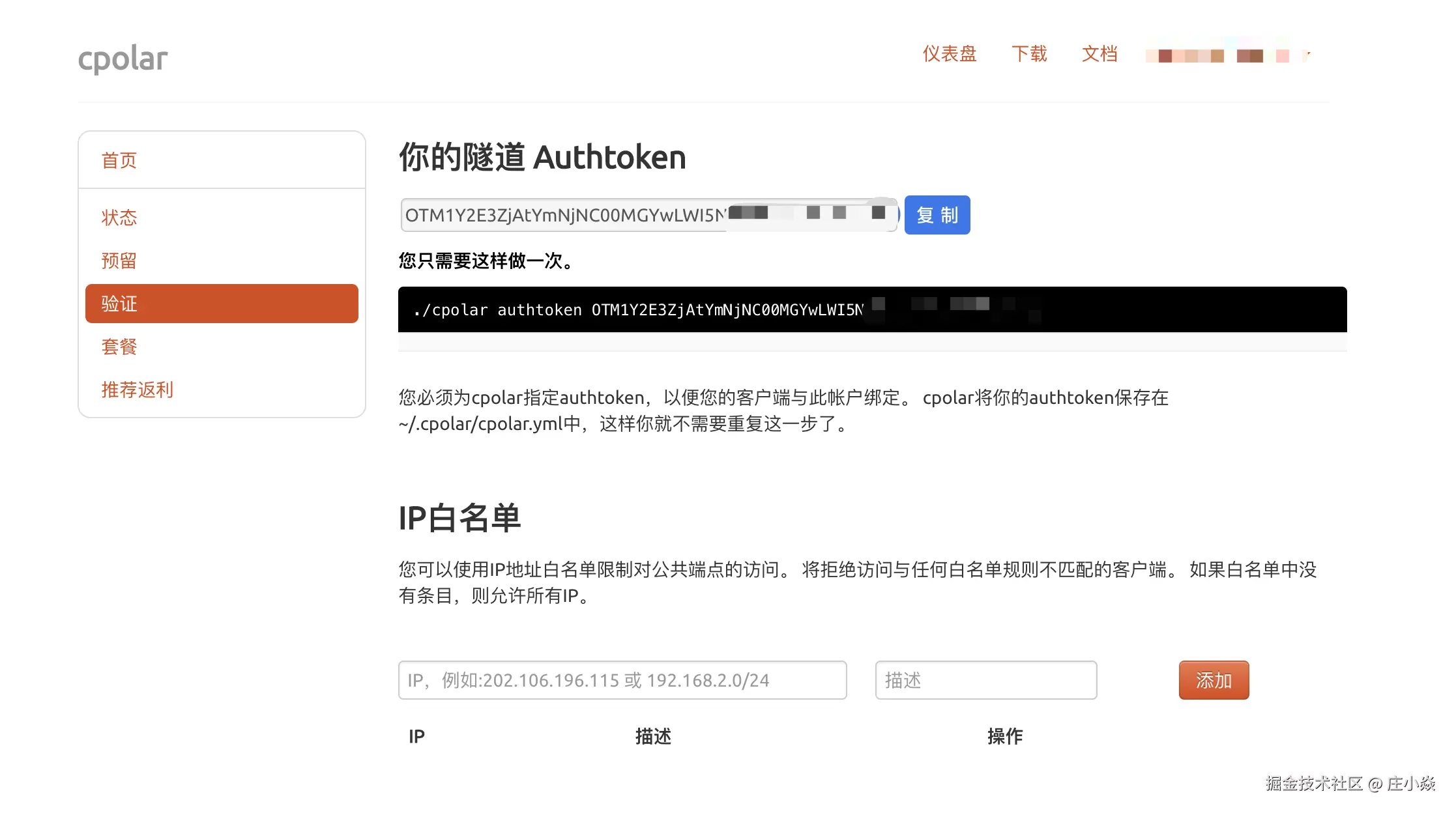 登录cpolar官网后台,点击左侧的验证,查看自己的认证token,之后将token贴在命令行里