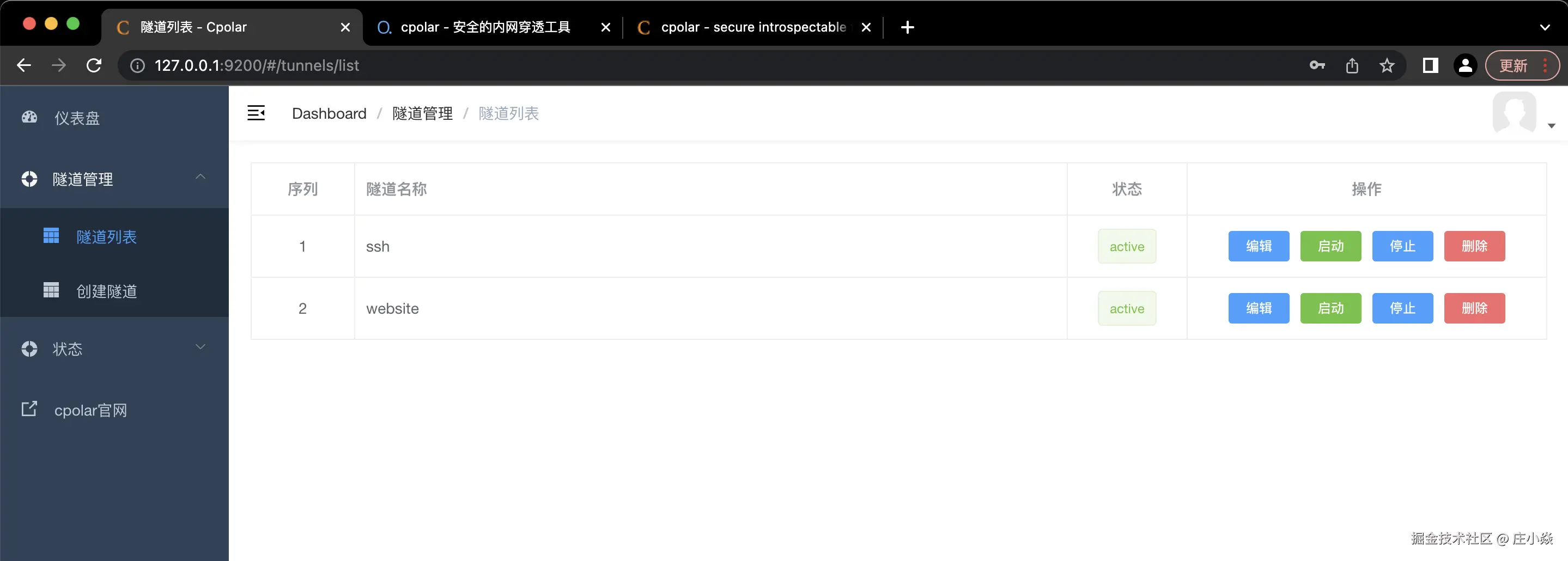 登录成功后,点击左侧仪表盘的隧道管理——隧道列表,可以看到两条样例隧道(可自行编辑或者删减)