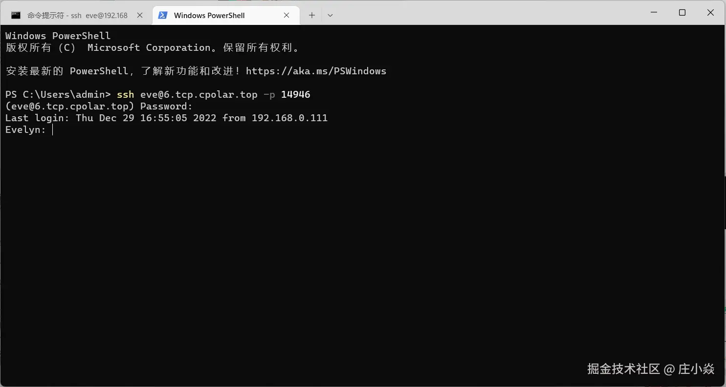 ssh MacOS用户名@公网地址 -p 公网端口号。注意:由于我们的本地22端口到了公网被映射到了14946端口,所以,ssh命令需要加-p参数,后面加公网隧道端口号