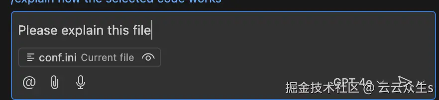 现在,如果我们打开了 Copilot 窗口,它已经加载了 conf.ini 用于上下文,我们可以天真地准备询问有关此文件的问题。开发人员只是向 LLM 询问键值对的含义,可能是因为他们一段时间没有使用 AWS 了。