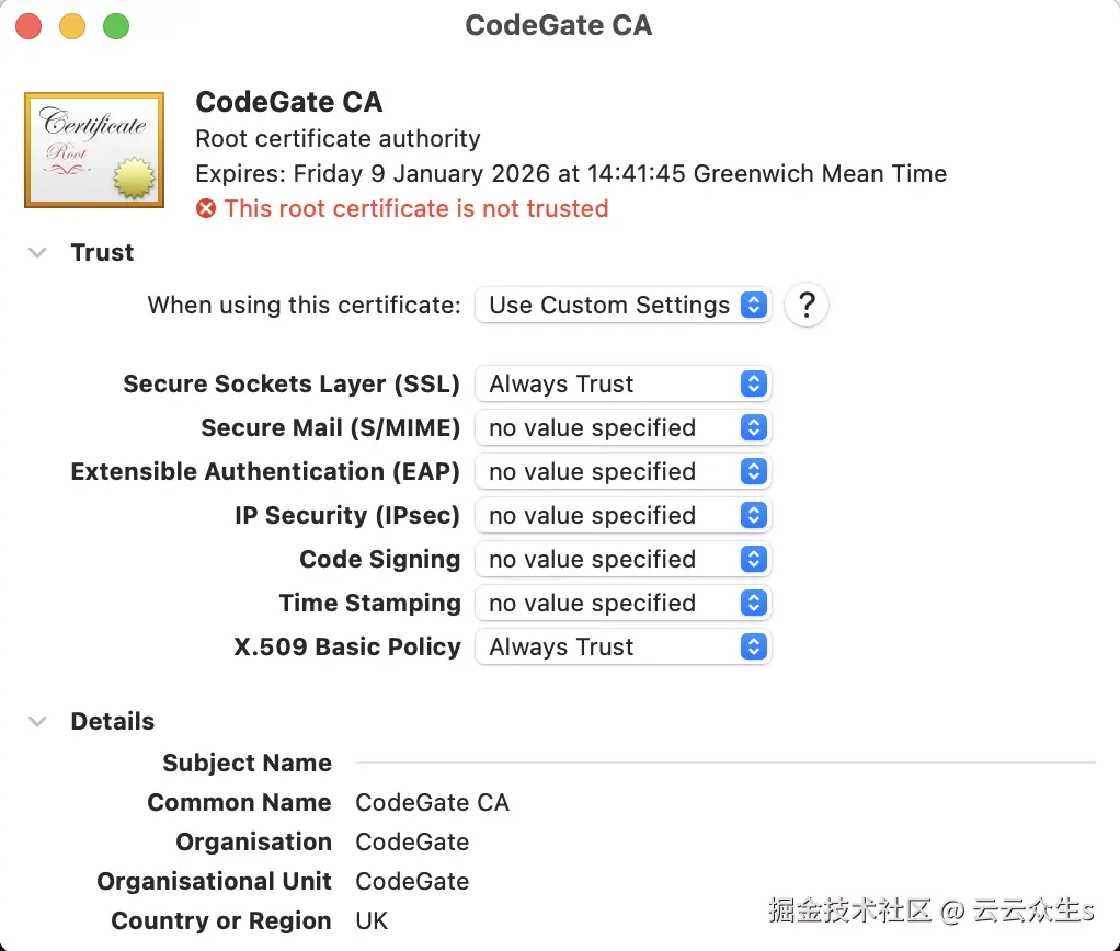 打开钥匙串访问中登录钥匙串中新添加的证书,并确保两个条目“SSL”和“X.509”都为“始终信任”: