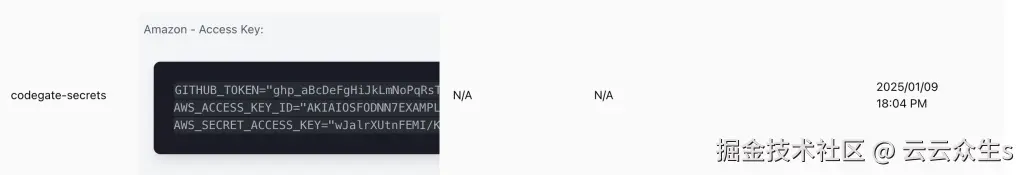首先,CodeGate 检测到其中一个密钥是 AWS_ACCESS_KEY_ID,屏蔽原始值并用加密值代替: