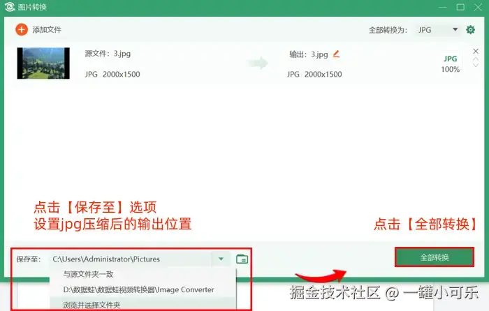 步骤3:点击【保存至】选项,设置jpg压缩后的输出位置,然后点击【全部转换】即可。