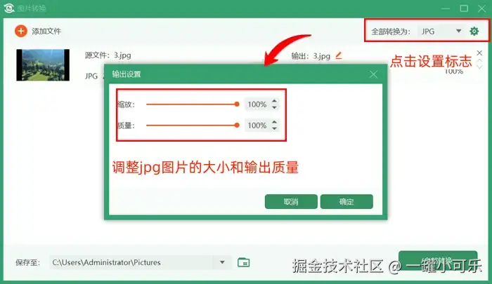 步骤2:添加jpg文件后,点击设置标志,调整jpg图片的大小和输出质量。