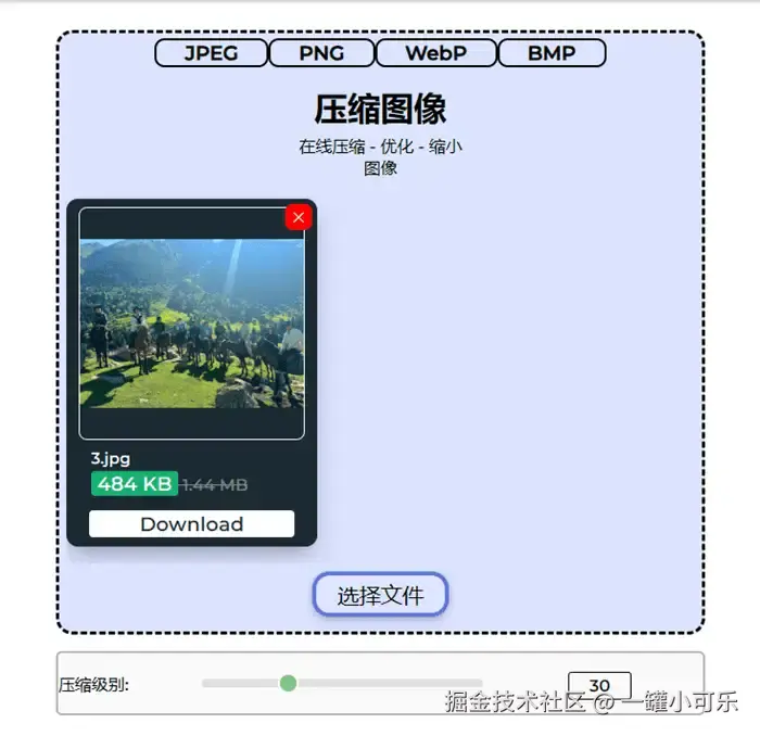 【图片压缩步骤】: 选择文件——调整压缩级别——Download。