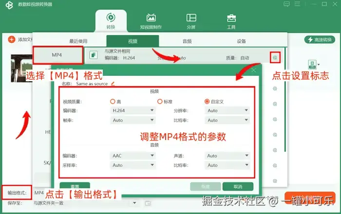 步骤2:点击【输出格式】进入音视频格式列表,选择视频格式列表下的【MP4】格式,然后点击设置标志,调整MP4格式的参数。