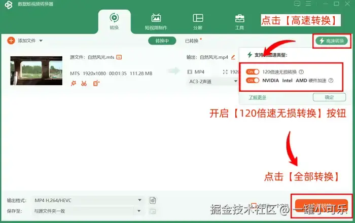步骤3:点击【高速转换】,将其下列选项的【120倍速无损转换】按钮开启,最后点击【全部转换】即可。