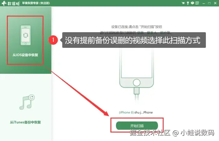 比如数据蛙苹果恢复专家这款软件,它能够深入苹果手机内部,找到并高效恢复那些被误删的视频。而且,它还没有恢复时间的限制,只要你有需要,它就能随时为你效劳。操作也超级简单,下面就根据提示进行操作吧!