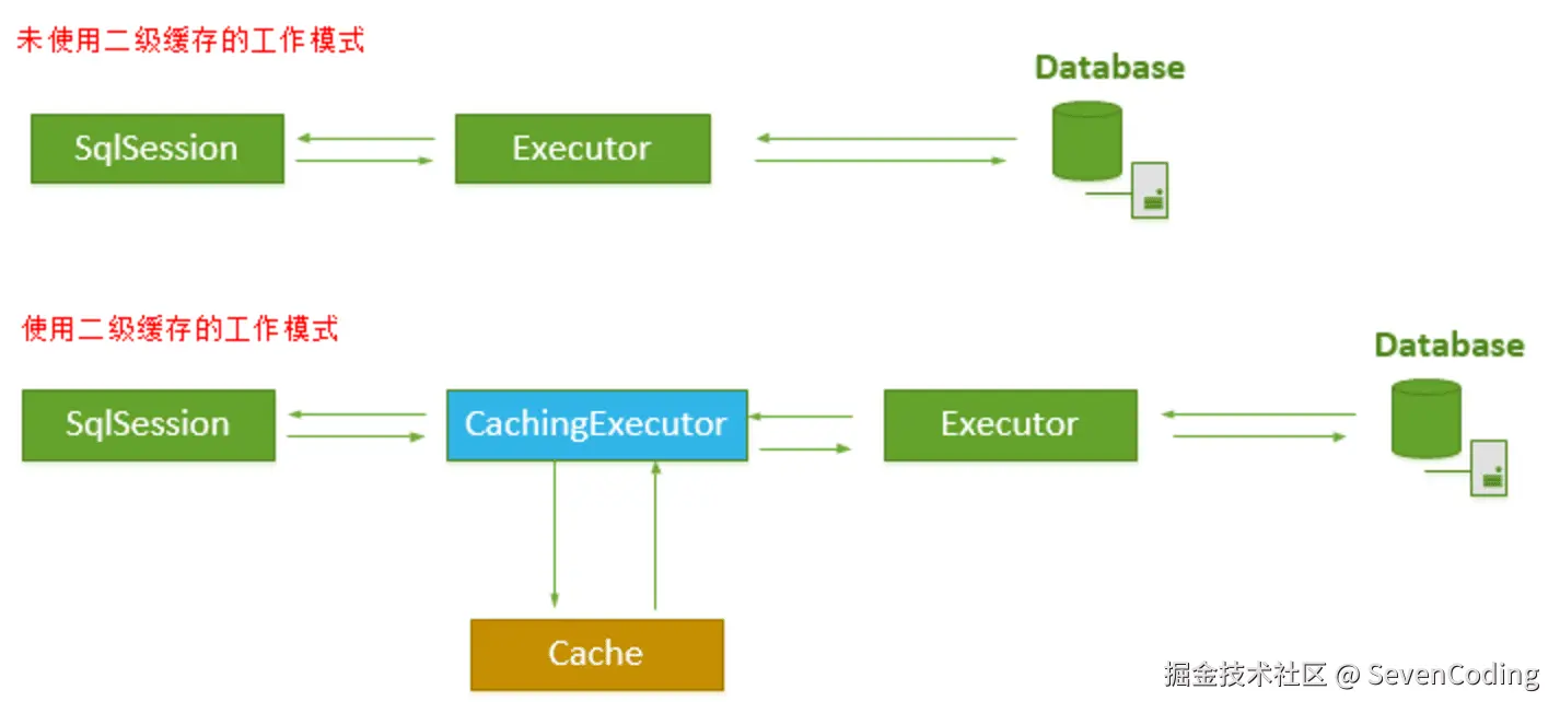请注意,如果你的MyBatis使用了二级缓存,并且你的Mapper和select语句也配置使用了二级缓存,那么在执行select查询的时候,MyBatis会先从二级缓存中取输入,其次才是一级缓存,即MyBatis查询数据的顺序是:二级缓存 ———> 一级缓存 ——> 数据库。