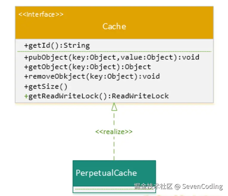 如下图所示,MyBatis定义了一个org.apache.ibatis.cache.Cache接口作为其Cache提供者的SPI(Service Provider Interface) ,所有的MyBatis内部的Cache缓存,都应该实现这一接口。MyBatis定义了一个PerpetualCache实现类实现了Cache接口,实际上,在SqlSession对象里的Executor对象内维护的Cache类型实例对象,就是PerpetualCache子类创建的。