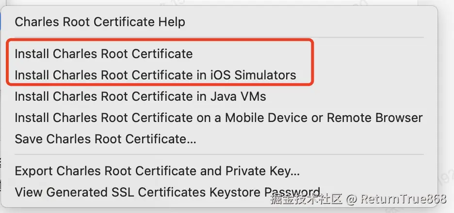 继续在 Charles 里,点击顶部菜单栏的 Help -> SSL Proxying -> Install Charles Root Certificate in iOS Simulators;