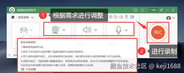 步骤3:在 【游戏录制】 页面里,我们先了解游戏录制的帮助,然后对摄像头、声音等录制参数进行调整。然后可以点击 【REC】 按钮进行录制,也能使用快捷键 【Alt+S】 进行快速录制。