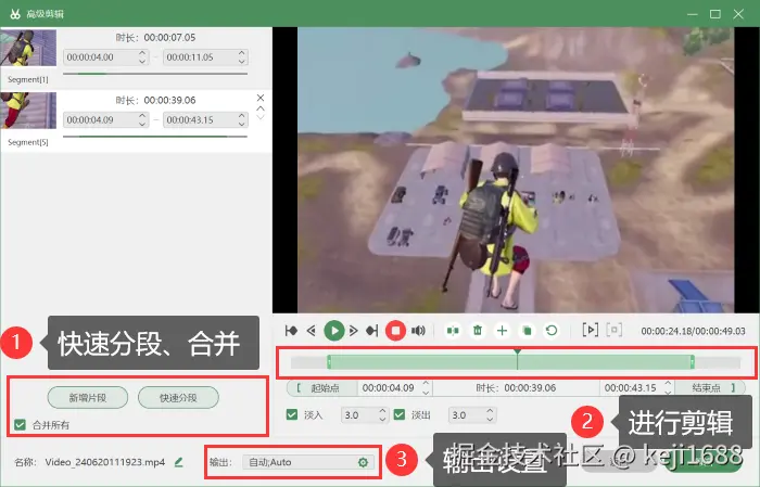 步骤4:想要停止录制时,可以使用 【Alt+R】 结束录制。结束录制后视频会主动弹出预览,可以在 【高级剪辑】 功能页面对视频进行剪辑、增加特效、调整输出设置参数等处理。