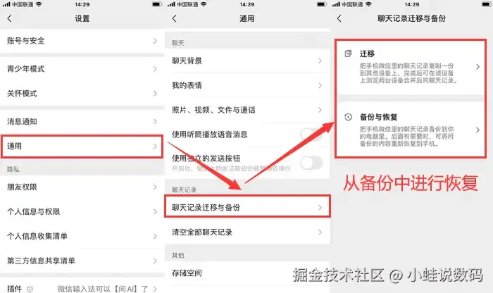步骤2:选择 【聊天记录备份与迁移】 ,点击 【恢复聊天记录至手机】 。选择需要恢复的备份文件,等待恢复完成。