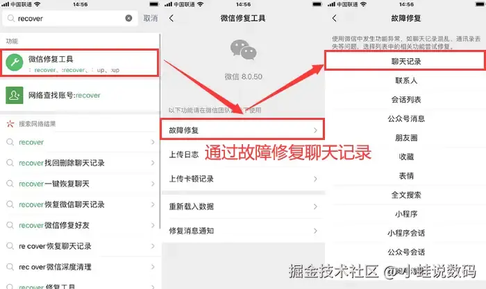 对于因软件出错而丢失的聊天记录,微信提供了【微信修复工具】来帮助你恢复。操作步骤: