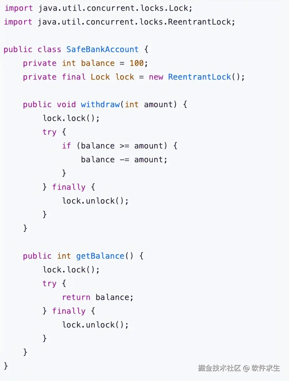 上面的 withdraw 和 getBalance 方法都被 synchronized 修饰,保证了对 balance 的访问是线程安全的。