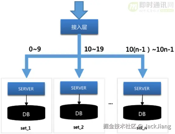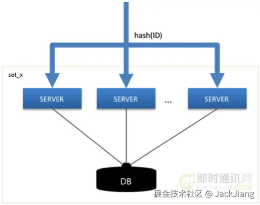 红包系统根据这个红包 ID,按一定的规则(如按 ID 尾号取模等),垂直上下切分。切分后,一个垂直链条上的逻辑 Server 服务器、DB 统称为一个 SET。