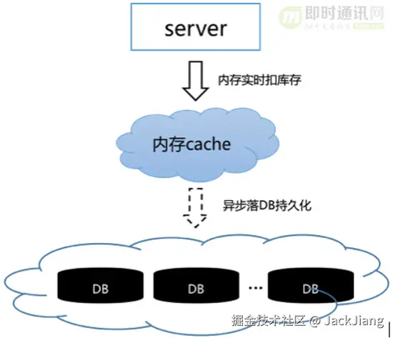 如图 2 所示,将“实时扣库存”的行为上移到内存 Cache 中操作,内存 Cache 操作成功直接给 Server 返回成功,然后异步落 DB 持久化。