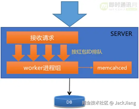 为了防止 Server 中的请求队列过载导致队列被降级,从而所有请求拥进 DB,系统增加了与 Server 服务器同机部署的 memcached,用于控制拆同一个红包的请求并发数。
