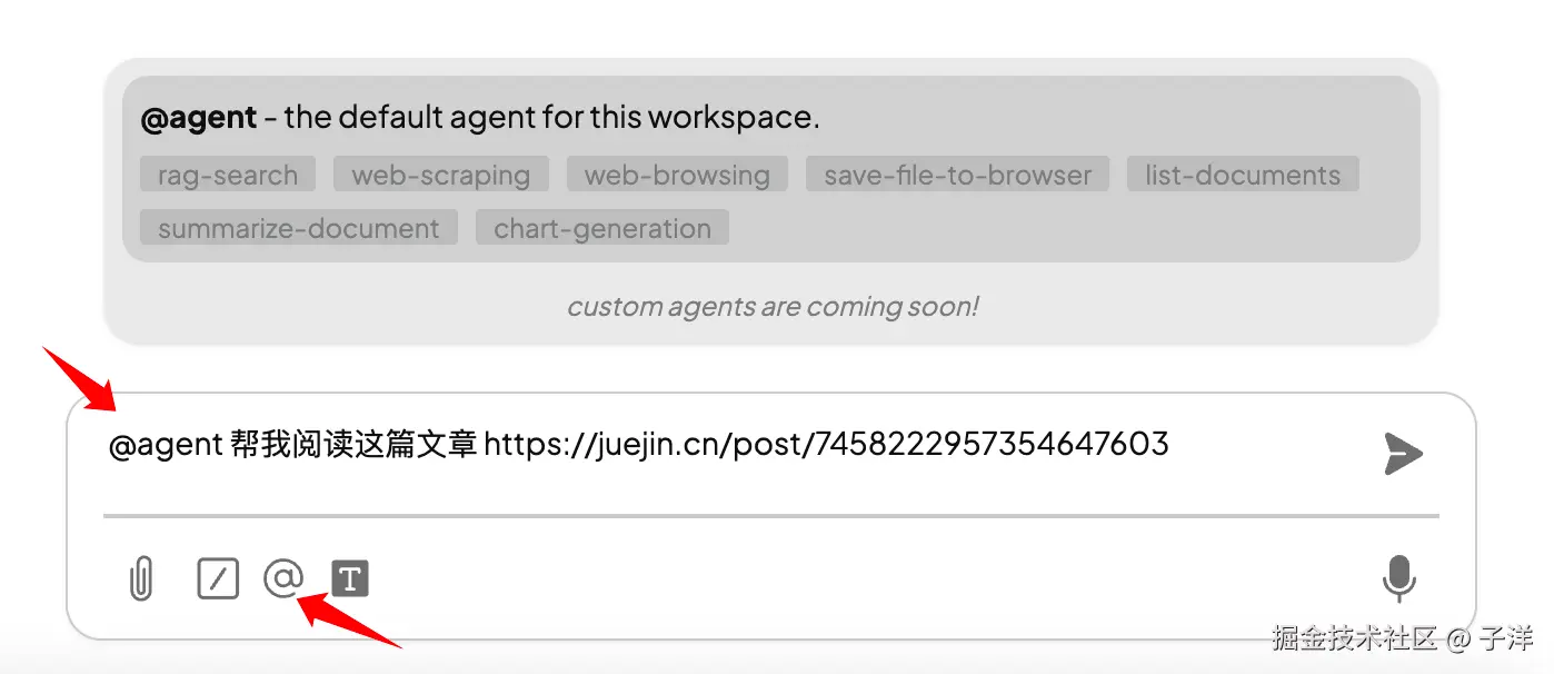 AnythingLLM 支持 AI 代理功能,用户可以通过 Agent 完成特定任务。除了官方提供的默认 Agent(如 Scrape websites),还支持通过社区添加自定义 Agent。
