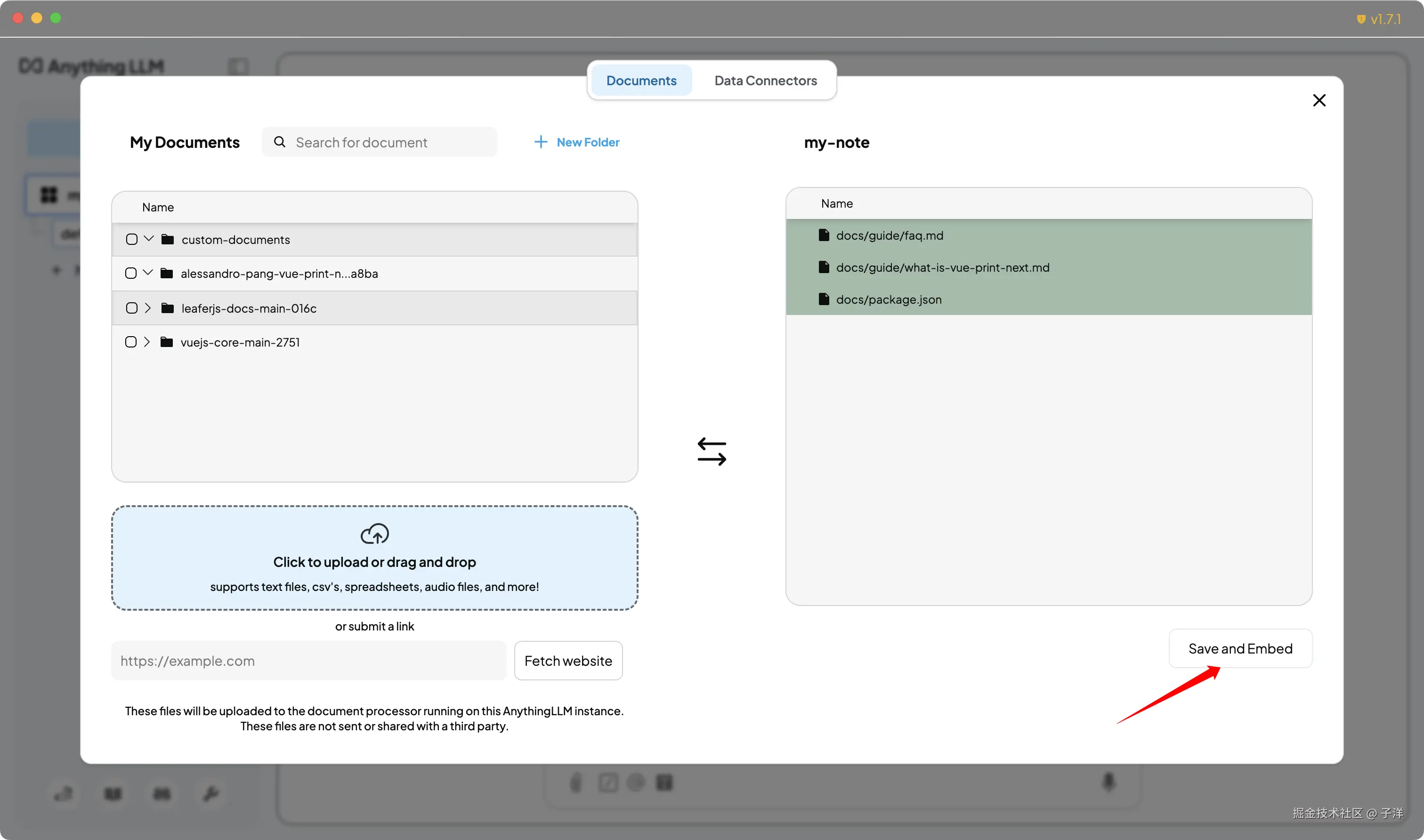添加到工作区后,点击 Save and Embed,将文档内容转换为向量检索所需的嵌入数据结构。此过程可能会消耗较多 CPU 资源,具体时间取决于文档数量。