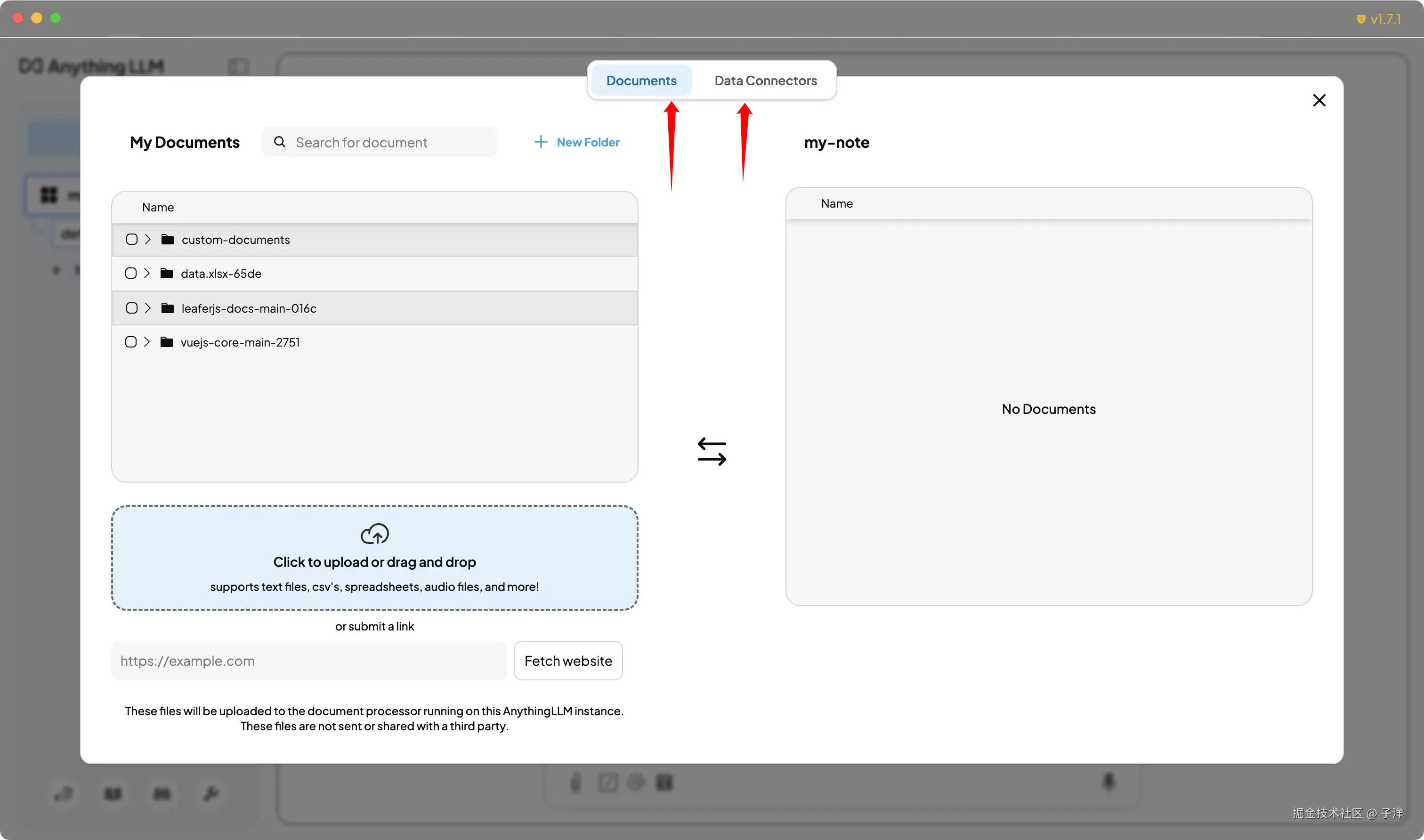 点击上传图标,可以管理当前工作区的知识库。AnythingLLM 支持以下三种方式上传文档: