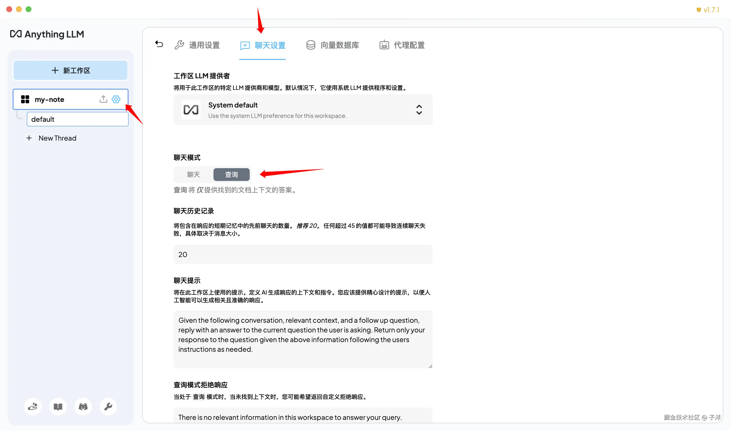 将文档添加到工作区后,用户可以通过设置聊天模式调整大模型的回复方式: