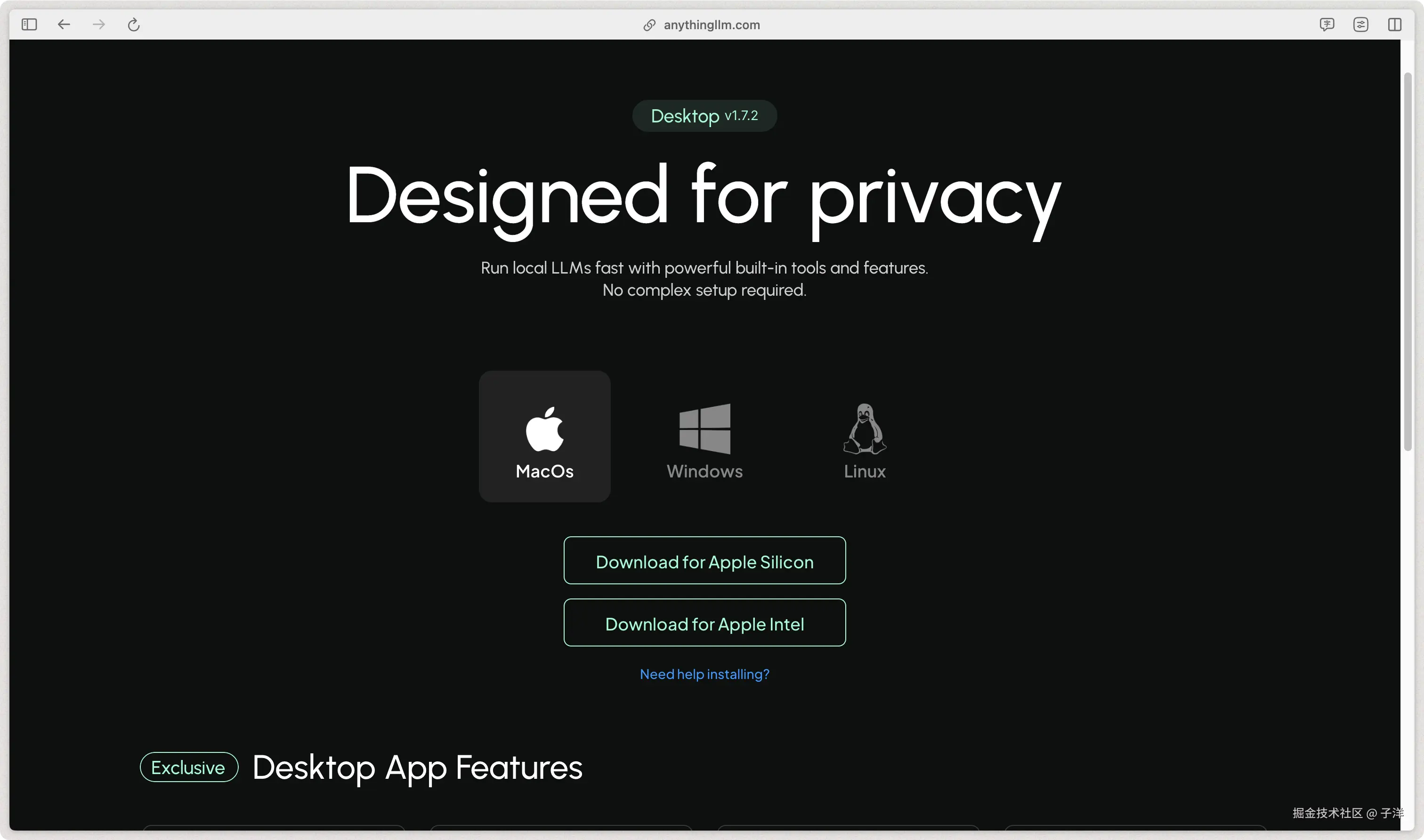 AnythingLLM 提供了 Mac、Windows 和 Linux 的安装包,用户可以直接从官网下载并安装。