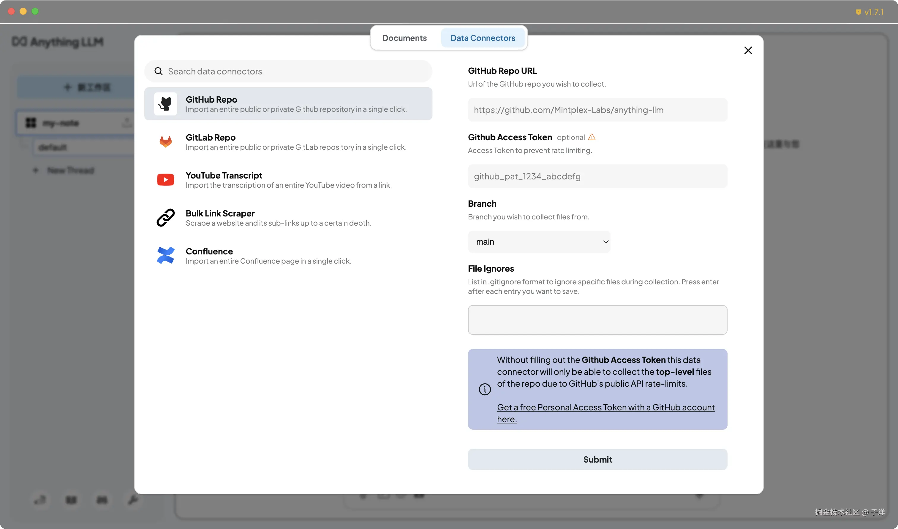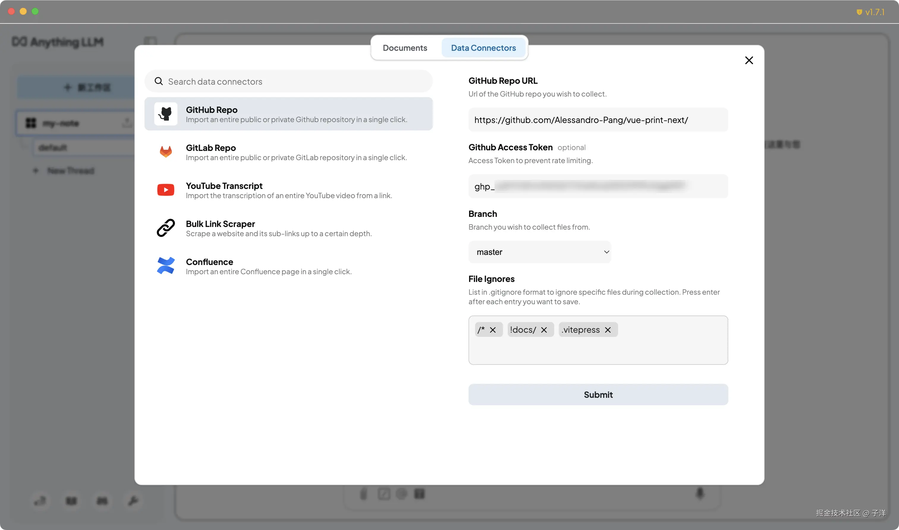 Data Connectors 功能支持从 GitHub、GitLab 仓库或网站爬取数据。用户只需输入仓库地址和 Token,即可导入指定目录或网页内容。