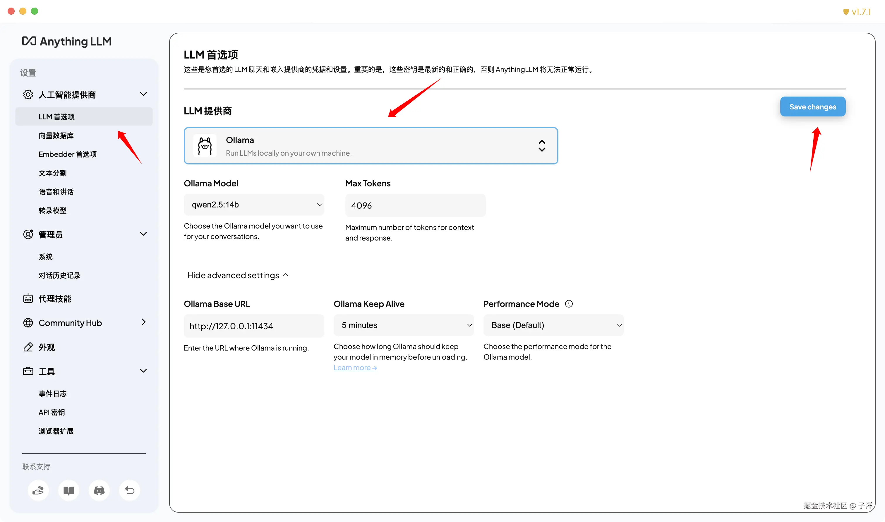 在 AnythingLLM 的设置页面,可以通过 LLM 首选项 修改 LLM 提供商。本文使用本地部署的 Ollama 和 qwen2.5:14b 模型。配置完成后,务必点击 Save changes 按钮保存设置。