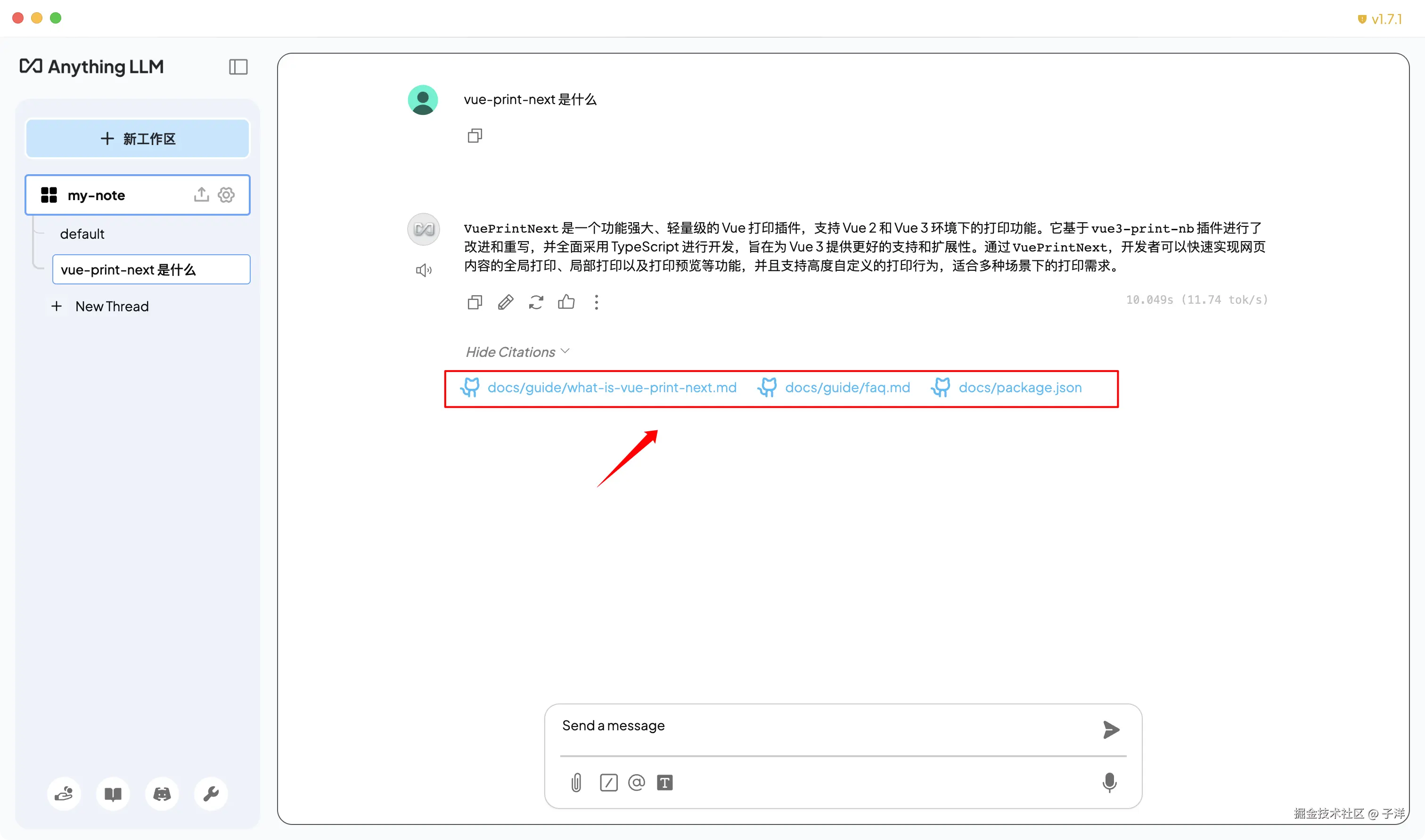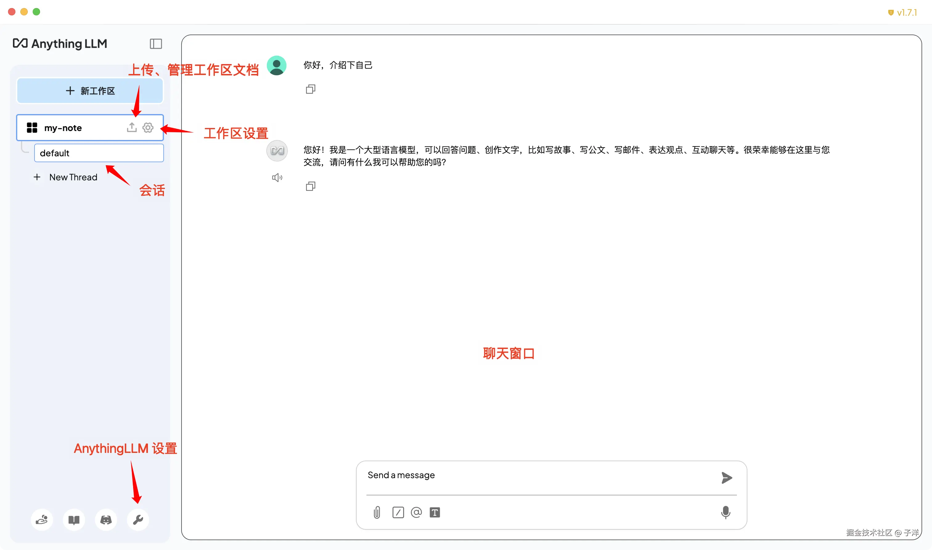 在聊天界面中,用户可以创建多个工作区。每个工作区可以独立管理文档和 LLM 设置,并支持多个会话(Thread),每个会话的上下文也是独立的。