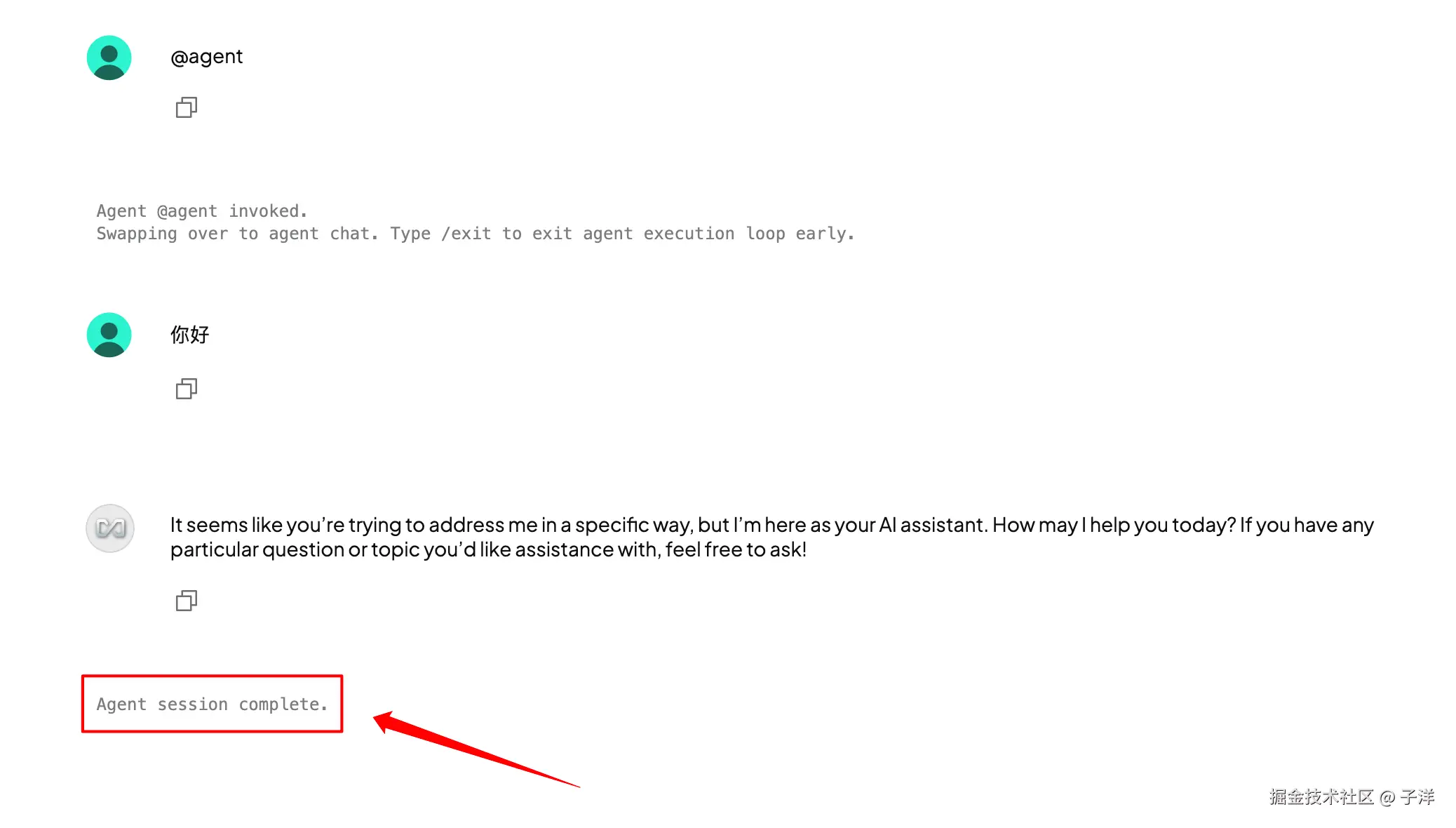 当会话提示 Agent session complete 时,表示已退出 Agent 会话。