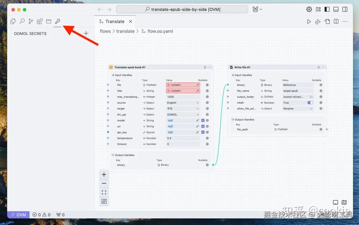 现在,使用这个 books-translater 开源项目来制作。这个项目可以在 oomol 的社区商店中搜索到。(oomol 会使用容器技术,将项目的各种依赖自动安装好,省去折腾。你可以在官网下载 oomol。)