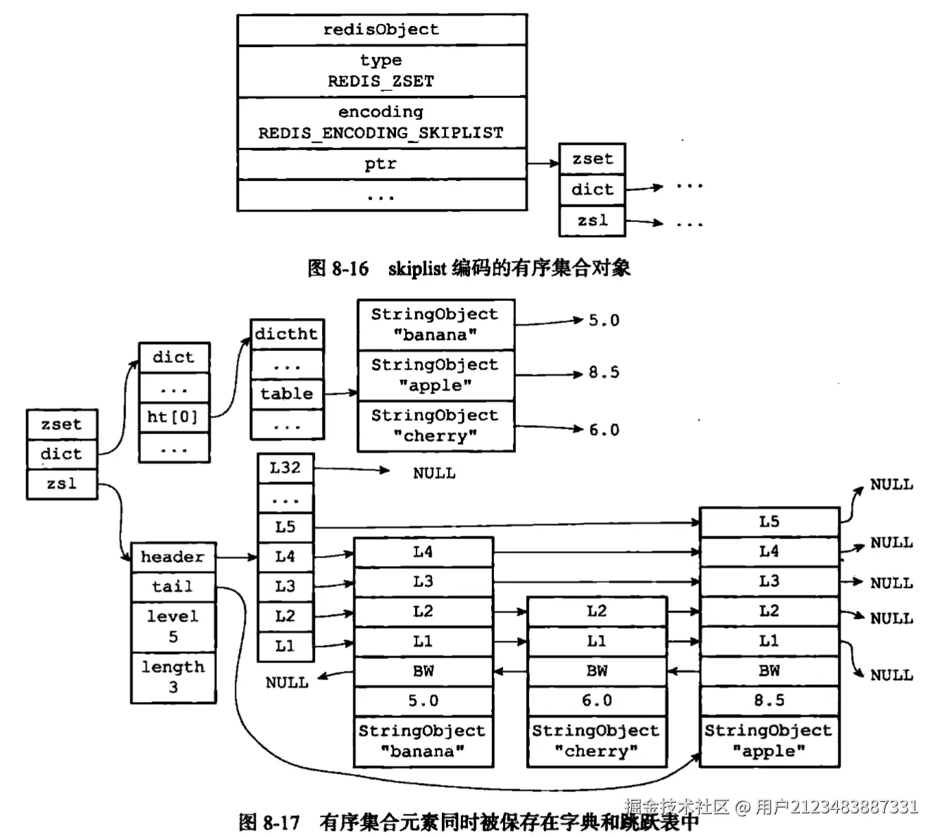 - skiplist编码的有序集合对象使用zset结构作为底层实现,一个zset结构同时包含一个字典和一个跳跃表: