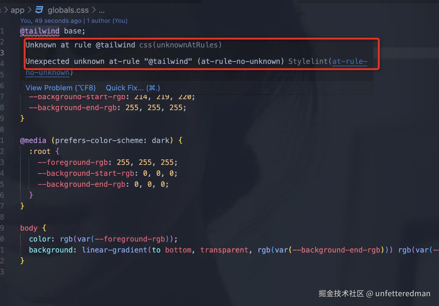 如果项目中配置了stylelint,并且使用了tailwindcss,会报这个错误