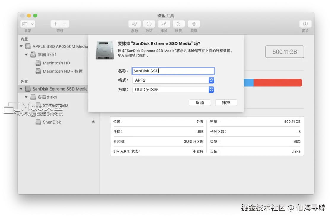 名称随便填,可以按照自己的意愿个性化填写,格式有「APFS」就选「APFS」,没有就选「Mac OS扩展(日志式)」,方案选「GUID分区图」,选择完毕后点击「抹掉」。
